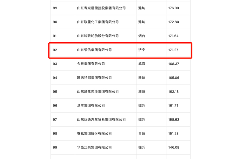 10月27日,由《山東商報(bào)》編制的“2020魯企300強(qiáng)”正式發(fā)布。山東榮信集團(tuán)有限公司以171.27億元營(yíng)業(yè)收入位列第92位。集團(tuán)已連續(xù)兩年獲得魯企300強(qiáng),也是繼2020年榮膺中國(guó)制造業(yè)民營(yíng)企業(yè)500強(qiáng)、山東民營(yíng)企業(yè)100強(qiáng)、山東省民營(yíng)企業(yè)品牌價(jià)值100強(qiáng)、山東省高端化工產(chǎn)業(yè)民營(yíng)企業(yè)10強(qiáng)及中國(guó)石油和化工企業(yè)500強(qiáng)等榮譽(yù)稱號(hào)之后,今年收獲的又一殊榮。