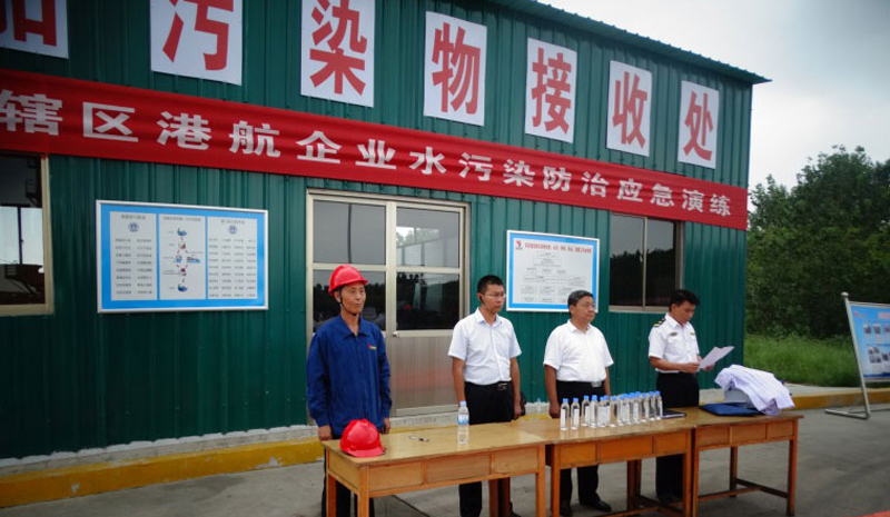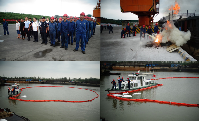 活動(dòng)分為港口岸上火災(zāi)消防演練以及水域環(huán)境污染緊急處置兩部分進(jìn)行。岸上消防演練首先模擬了??看耙馔獍l(fā)生火災(zāi),按照預(yù)案部署,應(yīng)急救援小組立即開展滅火救援工作。事故救援組深入火災(zāi)現(xiàn)場(chǎng)全面搜救被困人員,搶險(xiǎn)組合理設(shè)置滅火陣地,控制火勢(shì)蔓延,最后將火情撲滅。水域環(huán)境污染演練模擬了物流中心裝船作業(yè)船只在港區(qū)靠泊作業(yè)期間,意外跑冒黑色污染物,現(xiàn)場(chǎng)員工發(fā)現(xiàn)后立刻向現(xiàn)場(chǎng)指揮部報(bào)告。指揮部接報(bào)后,在命令意外泄污船只先自行控制污染源的同時(shí),立即啟動(dòng)物流中心船舶作業(yè)活動(dòng)污染水域應(yīng)急預(yù)案,調(diào)遣應(yīng)急小組前往清污,并向濟(jì)寧市港航局鄒西航管處匯報(bào)。應(yīng)急小組拖掛圍油纜到達(dá)現(xiàn)場(chǎng)后,分別拖住圍油纜的一頭靠近不斷擴(kuò)散的污染物,從兩邊包抄將污染物團(tuán)團(tuán)包圍起來(lái)。另有一方面配合海事船只圍油纜船,防止污染擴(kuò)散。此外,應(yīng)急人員在統(tǒng)一指揮下向河中拋撒吸油氈,清理遺留在圍油纜外的零星污染。待污染物被圍油纜徹底圍攏后,清污隊(duì)員立刻對(duì)污染物進(jìn)行回收。約半小時(shí)后,污染物被全部清除。