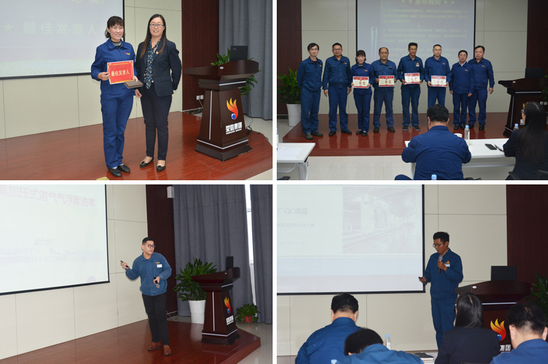 參選的QC課題緊緊圍繞生產(chǎn)技術(shù)改造、檢維修費(fèi)用縮減、環(huán)保設(shè)施升級(jí)等難題展開調(diào)研和改善。經(jīng)過講演人員的細(xì)致解說,評(píng)審小組對(duì)各項(xiàng)成果進(jìn)行現(xiàn)場(chǎng)點(diǎn)評(píng)。最終,動(dòng)力分廠發(fā)布的《提高加壓式溶氣氣浮除油率》、恒信科技發(fā)布的《提高產(chǎn)品精制的生產(chǎn)能力》斬獲一等獎(jiǎng),備煤分廠發(fā)布的《縮短細(xì)粉碎機(jī)開車時(shí)間》等QC課題榮獲二等獎(jiǎng),甲醇分廠講解人常慶英獲得“最佳發(fā)表人”獎(jiǎng)。