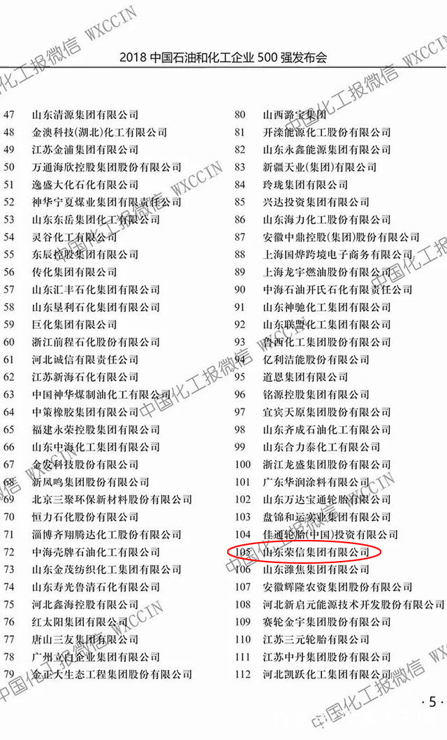 8月22日,由中國(guó)石油和化學(xué)工業(yè)聯(lián)合會(huì)和中國(guó)化工企業(yè)管理協(xié)會(huì)主辦的“2018中國(guó)石油和化工企業(yè)500強(qiáng)發(fā)布會(huì)暨創(chuàng)新與引領(lǐng)——中國(guó)石油和化工大企業(yè)高峰論壇”在上海召開(kāi)。石油和化學(xué)工業(yè)規(guī)劃院、北京化工大學(xué)經(jīng)濟(jì)管理學(xué)院及數(shù)百家企業(yè)和機(jī)構(gòu)的代表共計(jì)400余人與會(huì),共同見(jiàn)證了賦有“中國(guó)石油和化工福布斯榜”之稱(chēng)的“中國(guó)石油和化工企業(yè)500強(qiáng)排行榜”的揭曉。其中山東榮信集團(tuán)有限公司強(qiáng)勢(shì)上榜,排名第105位。
